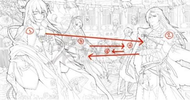 3.线条的粗细对比,在画面中人物据站视觉顺序前后大小的不同,从外轮廓的强化也会随着远近变化而越来越弱更好突出前面的人物,这后面的背景线的较细,更能突显出加粗外轮廓之后的人物的目的。