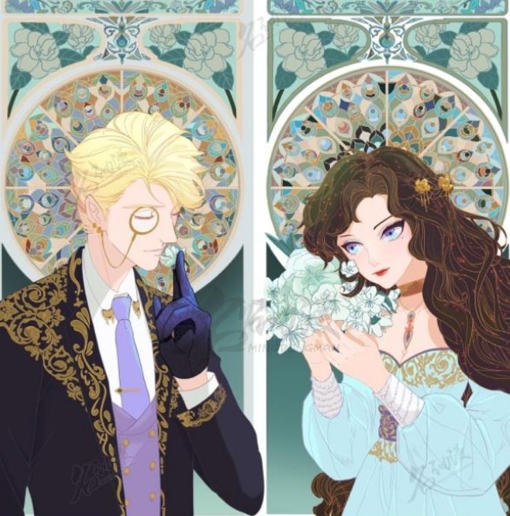 在人体学上人的脸部和身体是左右对称的,虽然在现实中这样的人是比较少的。但在我们在人物设计时,可以描绘理想化和有趣的想法表现自己的想要的。如图学员作品,两个人物的背景是对称相似的,人物手里的花与背景也是相应的。