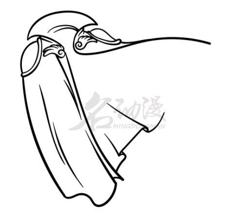 要点四:接着再将右边本体画出来,斗篷顶部以水平角度绘制一条弯曲的波浪线。从斗篷的左边底部再画一些更多的曲线。如图所示: