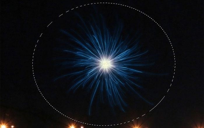 要点十六:到这里还没结束哦,还需要将烟花的烟雾也给表现出来。首先创建一个新层,然后从工具栏中选择椭圆选框工具。拖出一个比烟花稍大的椭圆。如图所示: