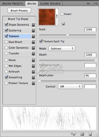 要点八: 点击进入纹理设置,从拉列表中找到并选择生锈的金属纹理。设置纹理后,将规模设置为100%,将模式设置为减除,深度设置为100%。如图所示: