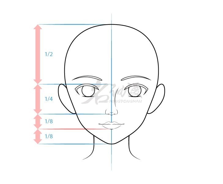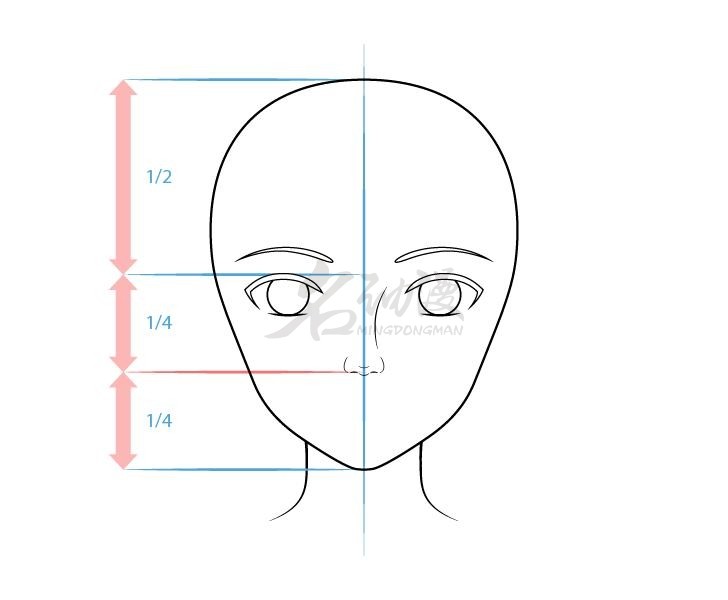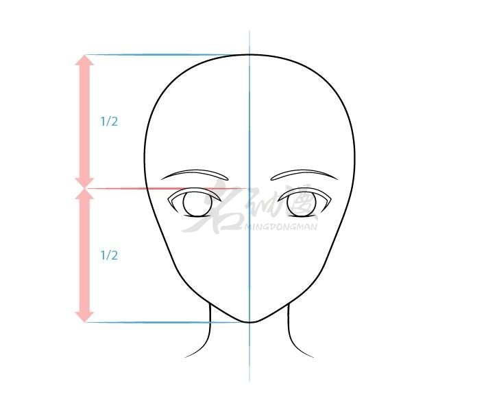 要点二:眼睛脸部的中间位置(脸部的二分之一的点上),跟眉毛分成上半部分和下半部分。在脸部中间画一条水平线并在该线下方画出眼睛。将眼睛隔开,以便在它们之间放置另一只眼睛。垂直画比普通动漫眼睛窄但比真眼睛大的眼睛。如图所示: