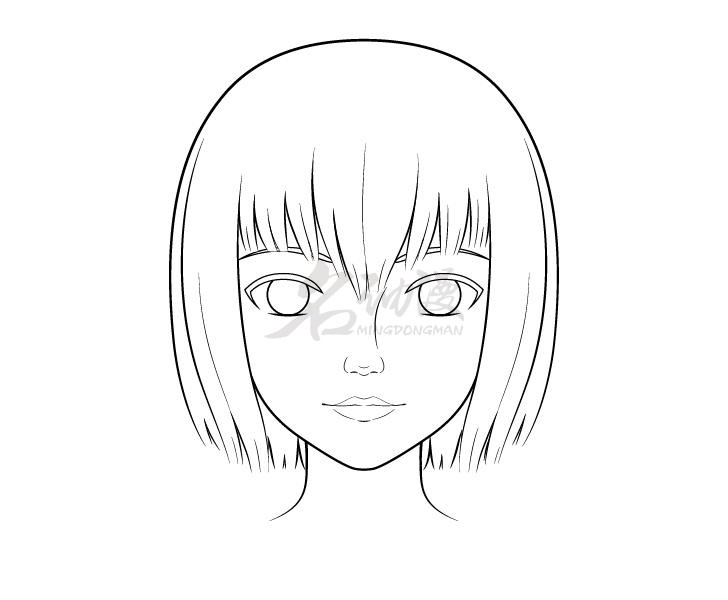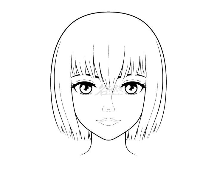 要点一:动漫人物通常有相当圆的脸。动漫脸的底部通常用两组主要线条绘制,一组从头顶向下延伸到嘴巴周围,另一组从那里延伸到下巴。下巴本身往往被画得完全尖尖或带有微小的曲线。如图所示: