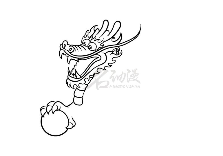 第二步:接着在脸部周围的画出尖锐的锯齿状线条作为在龙身上的毛发。沿着龙的胸部往下画一些方形,这些作为龙腹部上的鳞片。再画出一只抓着球的龙爪。如图所示: