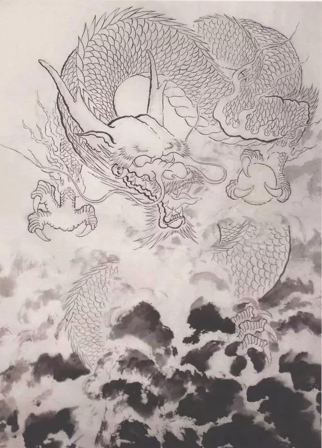 步骤一:将设计好的画稿衬在生宣纸下,用铅笔轻轻拷贝到宣纸上,过稿完成后用勾线笔勾勒。画龙身、龙头、龙爪等重要的结构部分。线条宜用侧锋,注意顿挫。龙须、龙鳍等需细致处理的地方以中锋用笔。粗细变化不必太大,以线条的粗细浓淡来勾勒龙头、龙身、龙尾的远近变化,一般由龙头到龙尾的顺序勾勒。
