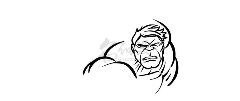 第一步:绿巨人是一个以大部分时间生气而闻名的角色,将以典型的横冲直撞中描绘绿巨人。从绿巨人的脸开始,先用一些曲线画出他的脸颊和下巴的轮廓,然后在侧面画他的耳朵。再将使用一些更有棱角、更尖的线条,让他的头发凌乱地放在头顶。在他脸上使用很多线条来表现他愤怒的表情。在他的肩膀和胸部顶部使用更多曲线来表示绿巨人的肌肉感。如图所示:
