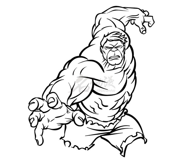 第三步:接着绘制绿巨人的手臂和手部。首先,让在肩膀的左边处画处一只手。这只手是往前张开的,这也是绿巨人在画面最近的部分。在这个视角上,要把这只有画的详细一些。而另一只手向着他身体的另一侧。再在腰部以下部分画出别撕裂的裤子时的锯齿状的线条。如图所示: