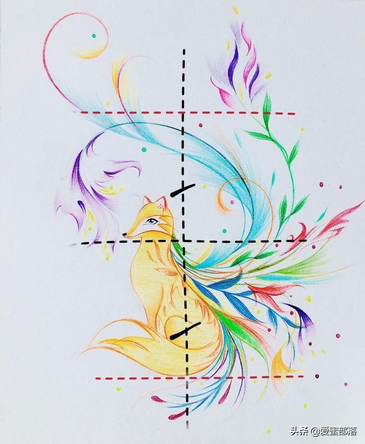 比如:以中心十字点到小狐狸头部最高距离,上方刚好等分画出十字定位线;以中心十字点到小狐狸嘴巴的宽距离,左右两侧等分画出十字线。小狐狸的头部设定在这个十字框格内,具体可见下图勾画分析图。