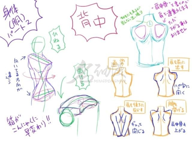 当把身体大幅度扭动时,肩线和骨盆线的方向会改变。 比如弯曲身体时,方块状的身体发生了变化变成有弧度了。 我们把脊柱想象成一条线,在绘制动态时想想脊柱的动态,这样躯干的运动就很容易理解了。