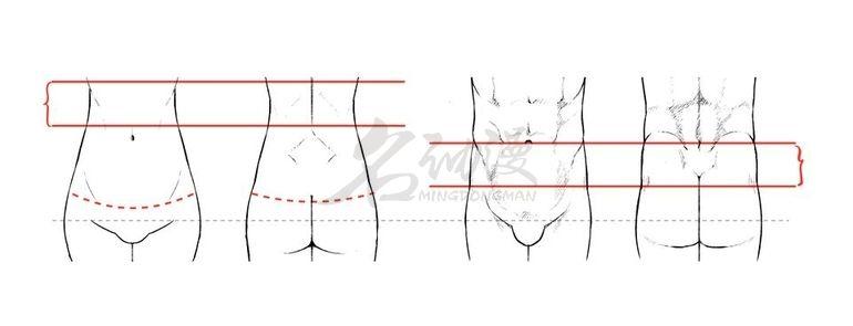 让我们详细比较一下男人和女人的体型。你可以看到肩膀(锁骨)和腹股沟(臀部最厚的地方)的高度不同。最重要的是腰部和下摆的位置关系。 较下摆相对于腰部位置的高度,可以看到女性的下摆离腰部较远,而男性的下摆则靠近腰部。