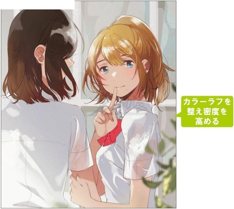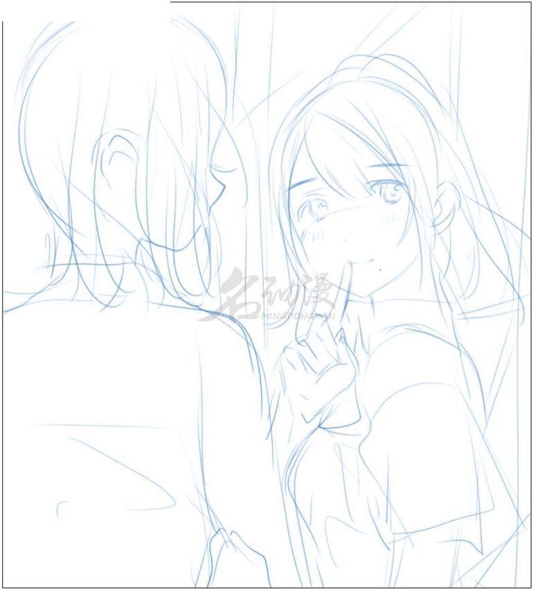 第四步:上述几个步骤都做完之后就可以开始刻画细节啦,我们从头部着手,画出发丝的质感以及高光。然后画出校服透光露出肉色的感觉,要注意颜色的变化。