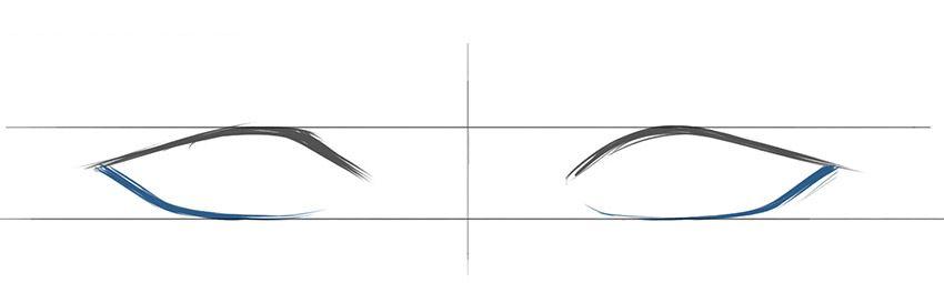画出眼睛的底部边缘。和以前一样,使用较浅的线条将帮助您创建正确的轮廓。请注意,最终轮廓在内侧变得更薄。一般来说,它看起来像两个钝角,其底部与底座底部水平线重合。这开始看起来像动漫风格,不是吗?