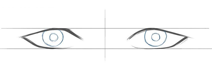 现在我们开始一个关于如何绘画动漫男孩眼睛的教程。首先最重要的任务是确定眼睛在纸上的形状和位置。为此,绘制三条交叉线。水平线之间的距离将有助于确定眼睛的高度。草图的位置将决定眼睛在纸张上的位置。请尝试在没有精密绘图助手的帮助下绘制这些线条,进行锻炼自己绘画的能力。