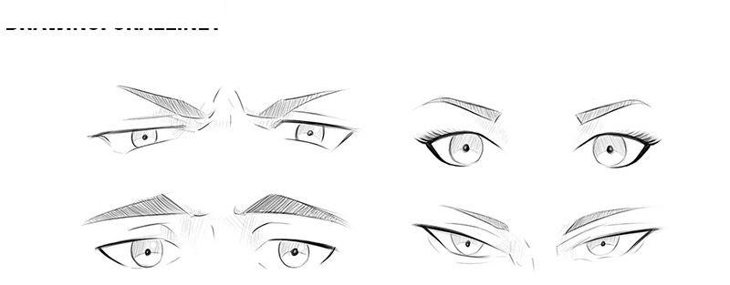 大家通过改变眼睛的形状和位置,可以轻松地改变动漫人物角色的情绪形态。如果大家要传达特别强烈的情绪,请参考下图改变眼睛轮廓和皱眉的方向长短之类的。
