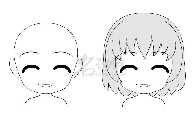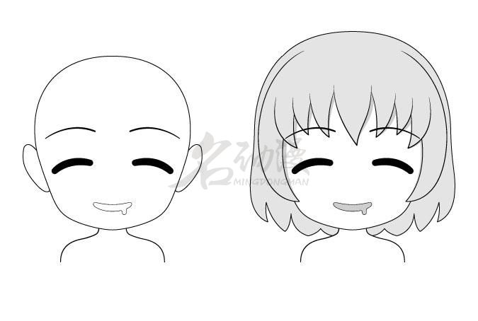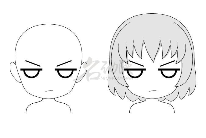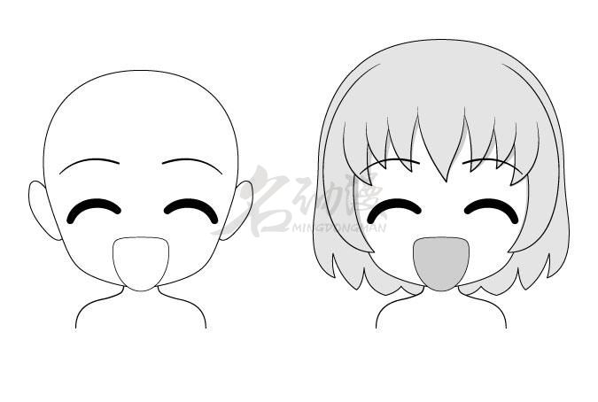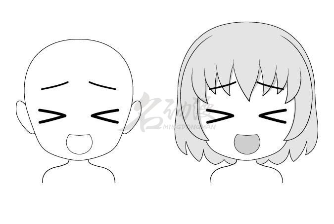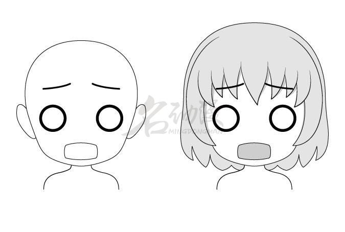 眼睛画成两个圆圈,轮廓很粗,没有其他细节。画出比正常眉毛更粗的眉毛(没有线条粗细变化),在朝向脸部中间升高的浅倒置曲线中。画一个长比高宽的张开的嘴巴。