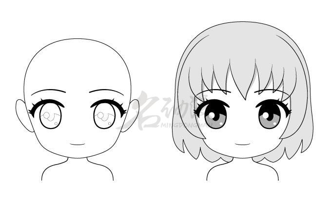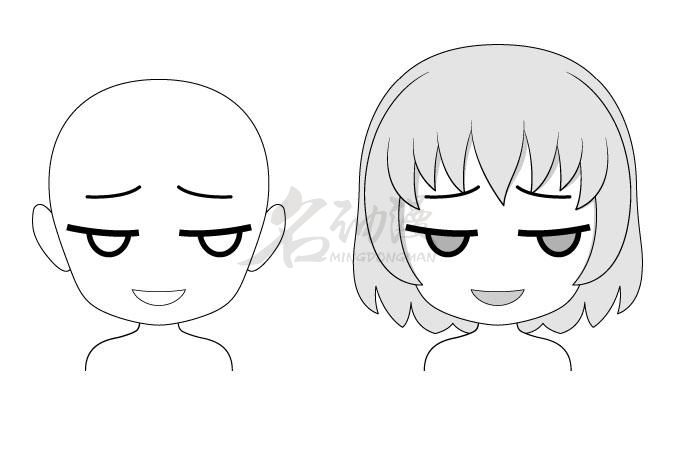 将眼睛稍微向侧面画成半椭圆形,顶部有粗线表示眼睑。画出略微向上弯曲并略微向下倾斜的眼睑线,朝向脸的中部。将眉毛拉得比正常情况下稍微靠近一点,向上弯曲朝向头部中间。将嘴巴画成微笑的形状。