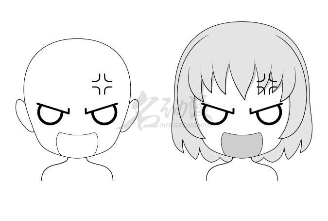 眼睛画成带有粗轮廓但顶部被眉毛略微切断的圆圈。将眉毛画成相当粗的直线,向下朝向脸部中间倾斜,但将眉毛的内端画直向上。眉毛应该做成一种“对勾”的形状。将嘴巴张开,一直到脸的底部并覆盖下巴。以向下的曲线画出嘴巴的顶部。最后为了让表情更加赤壁,在额头上画一个弹出的静脉图标(“#”字符号)。