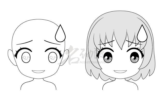 将瞳孔画得稍微小一点,并稍微看向一边。眉毛轻轻拉向脸部中间并向上弯曲。用浅浅的微笑画出嘴巴。在头部一侧的上部画一个大水滴图标来表示汗水。