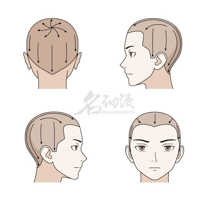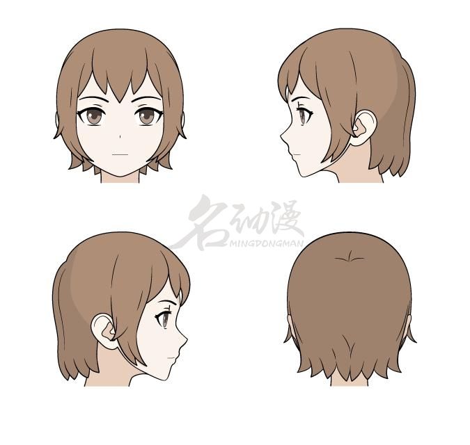 将短发的发际线画成示例的形状,头发末端有小一束。画一些稍微指向黏在一起的团块,看起来有点像湿在一起的头发。