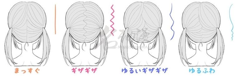要点三:从后背看,双马尾的分界线类型有很多,在很多动画和漫画中通常是第一种直线造型。当然,如果想打造一个蓬松柔软的都发,可以尝试打破直线的呆板,把发缝线画成波浪状,如第二、三和四个的波浪状造型。