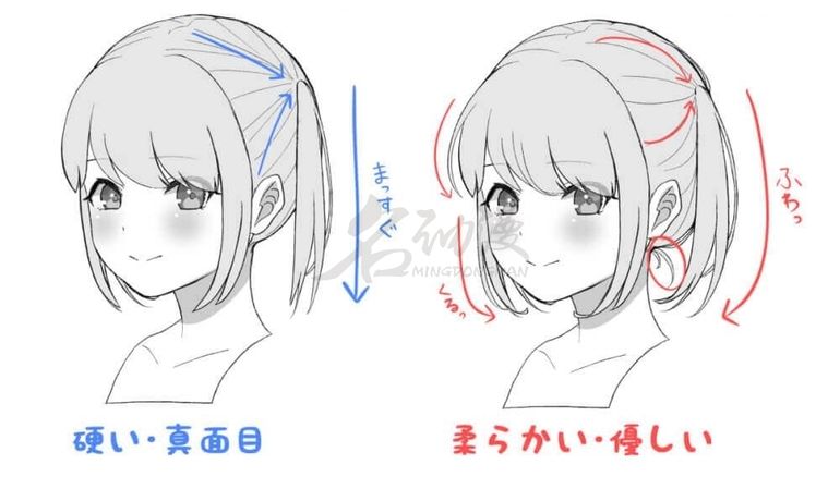 要点一:我认为把双马尾画好有几个要点,第一个就是画双马尾时可以适当把头发画得蓬松一些,不用画得太僵硬,比如图片左一造型紧紧绑着头发,给人特别严肃和坚硬的感觉,不够生动。可以修改成左二这样,头发的尖端稍微给它一个弧度,发丝的走向也画得松散一些,给人一种轻松感觉。