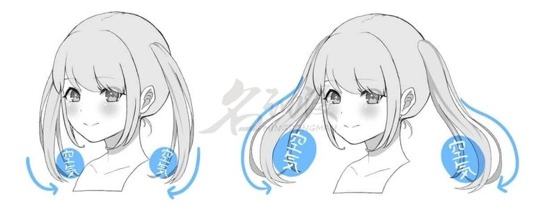 要点二:除了上面说到的内容,画双马尾时还要注意双马尾头发尖端的“空气感”,发尾的走向适当地给它体格弧度,像被风吹起来一样,给人一种发质蓬松的软头发印象。