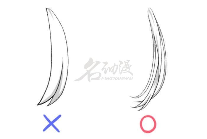 要点四:画头发最忌讳的事就是把发丝画得和钢铁一样呆板、坚硬,比如下图左一就是最典型的错误画法,我们在画头发时可以适当的将发丝分细来画,最好画出发丝与发丝之间的穿插关系,线条也要流畅,而不是简单地用两条直线概括一下就把头发敷衍了事。