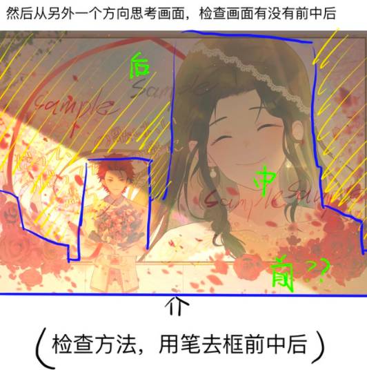 6、然后从另外一个方向思考画面,检查画面有没有前中后。(检查方法,用笔去框前中后)
