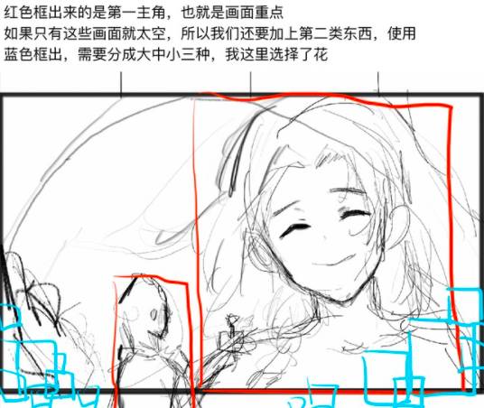 3、红色框出来的是第一主角,也就是画面重点。如果只有这些画面就太空,所以我们还要加上第二类东西,使用蓝色框出,需要分成大中小三种,我这里选择了花。