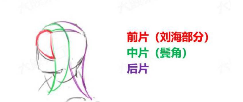 整个头型可以分为:分片前(刘海)、中片(鬓角)、后片。