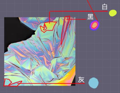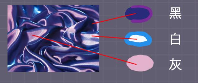 (1)所以在丝绸画法的基础上,我们来挑战一下镭射材质。首先分析黑白灰,你会发现在镭射布料是我暗部中还有一个反光的颜色。