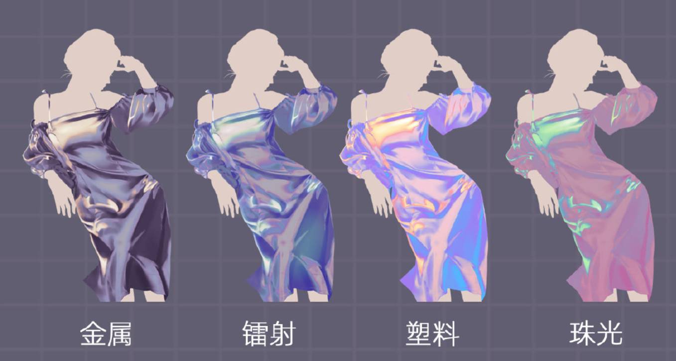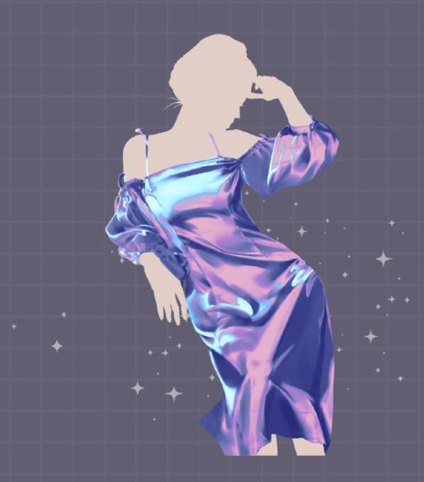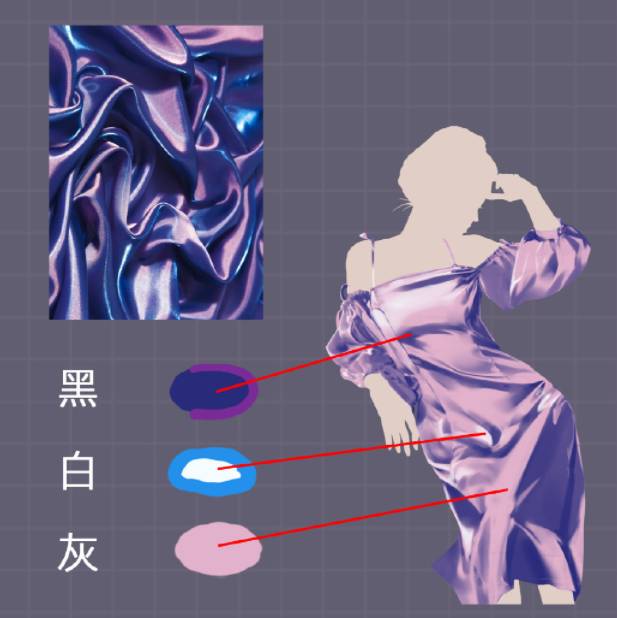 大家可以将裙子画出有镭射炫彩的效果,这样裙子会变得鲜艳漂亮!雷射光材质和普通布料最大的区别就是它的颜色变化很复杂。那要搞清楚雷射光材质怎么画,就要先搞清楚雷射光材质的面料颜色变化规律。以普通布料为例,他的黑白灰色调实际上只有一个颜色,发生变化只是明度。这也符合大多数人的画画习惯,先画固有色,然后把同色相的明度降低画出暗部。但是带有炫光色彩的面料,对于这种习惯就不大不友好,这也是好多人觉得镭射难画的原因。我们先从最简单的,颜色变化较少的丝绸面料开始分析。