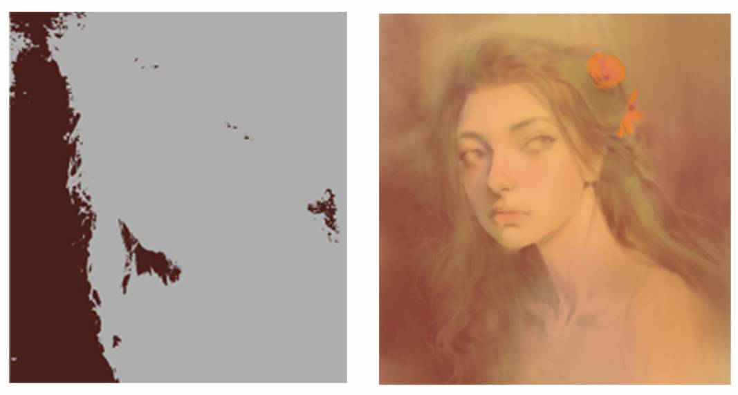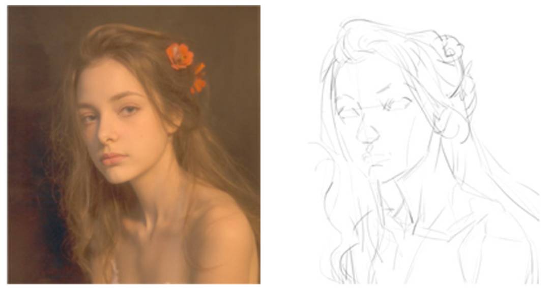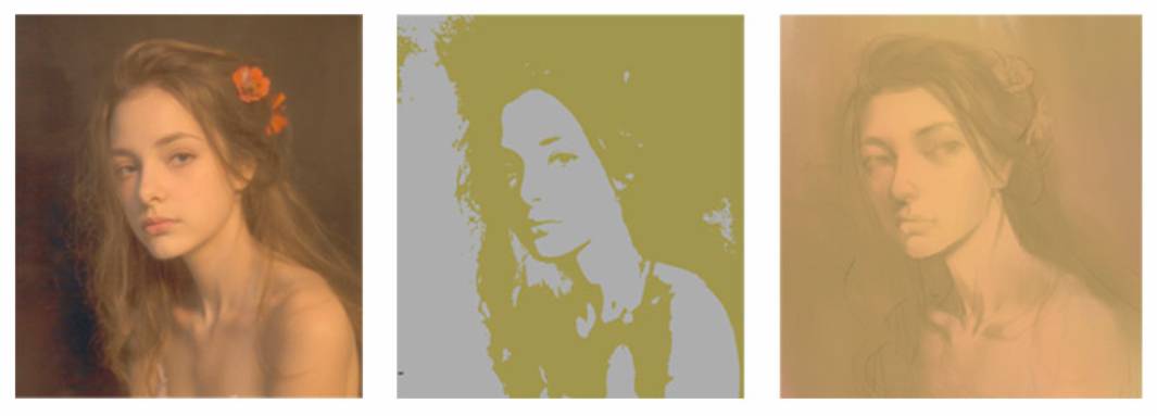 左边是原参照图,这照片中的灰调子面积很大且几乎没有高亮区域所以大致将画面分成三个色调即:亮灰调,中灰调和黑调。然后根据简化过的色调再简化一下每个色调的基色,这样整个画面里就大概被分成了,最亮的黄色调,稍暗的绿色调和最黑的红色调。这就是整张画的素描大关系和色彩大关系。