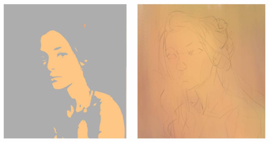 这一步其实也是整个环节里最难的一部,是素描基本功的时候到了!其实就是用这个深红色把画面里所有的闭塞区域都找出来然后画上,比较难处理的地方主要是人物的头发,窍门是先画出大的形状,然后用橡皮慢慢修饰形状的边缘,总之就是不停的在正负型里出来进去。