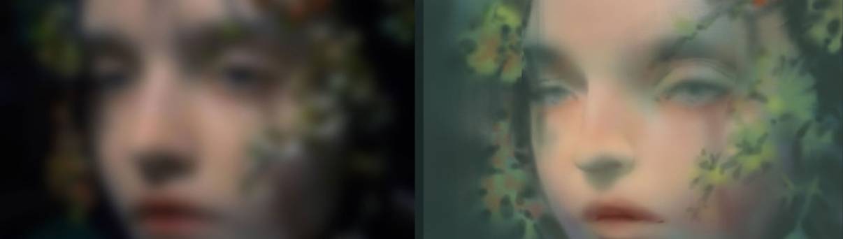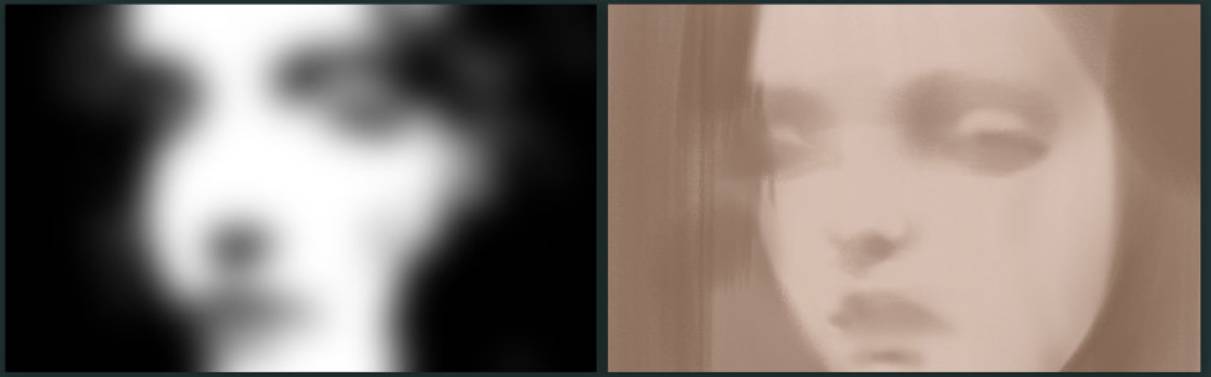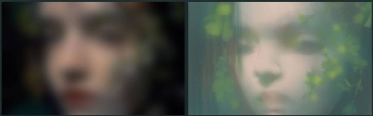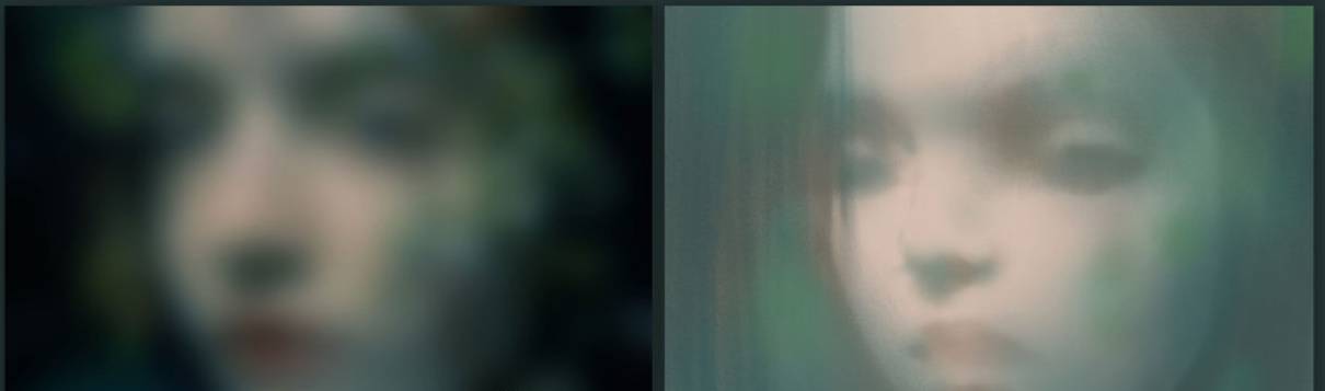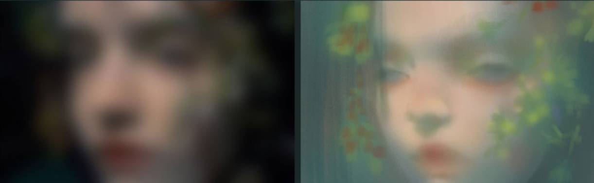 就像盖房子要先起梁,左图中模糊的团块就是张图的房梁,这是一种比较高效的起形方式。你需要眯起眼睛强迫自己主观的忽略掉所有的细节,只看到几个最大的团块,然后用喷枪把它们形状和位置标记在你的画布上。
