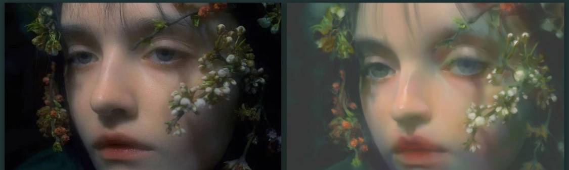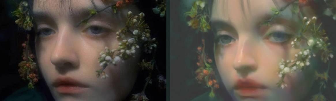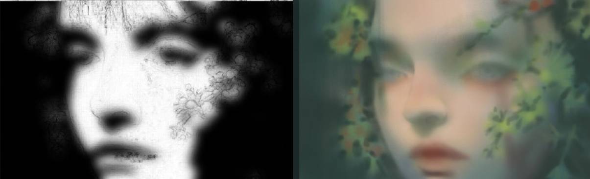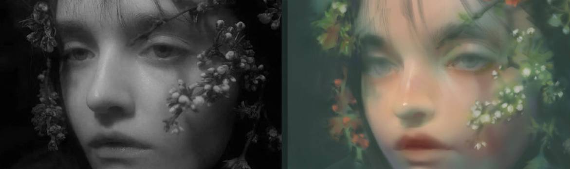 画完主色,我发现女孩面部的花枝更绿,且因为反光的原因,女孩的面部也呈现出斑斑点点的黄绿色。依然使用喷枪将有黄绿色感觉的地方扫一遍。现在还不是掐结构的时候,所以不用掐的太死,松松的扫在大致的位置上就可以了,千万不要去盯细节哦~