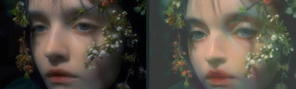 所谓颜色的主观的感受,很多时候就是我们刻意放大了某些颜色在整个画面中的权重,就比如这张图中,因为我偏爱青绿色调,所以我看到的画面中的调子更接近左图的状态。这一步主要目的是建立起来整个画面的冷暖关系,我把所有光照不到的地方都用青绿色刷了一遍。因为原本底色是暖色的,所以自然就呈现出有趣的颜色对比出来。