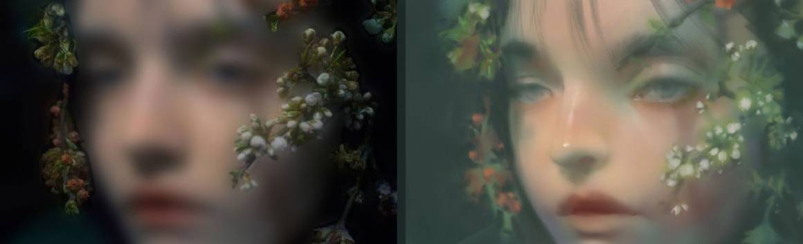 第6步做完,整个画面的色调和结构差不敌就都成型了,这儿时候就可以做一些锦上添花的事情了。我选择了有些纹理的笔刷把之前可以忽略掉的小花苞一一点出来,从平面上来说,人脸作为一个面,由花枝作为线,串联起个个的小花苞作为点,这样组成的点线面构成,在对比上就非常好看。从现在开始可以抠细节了!