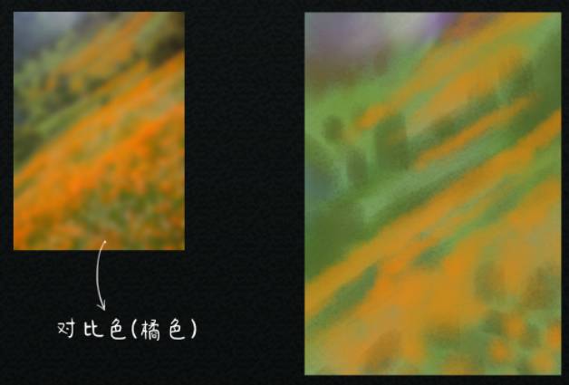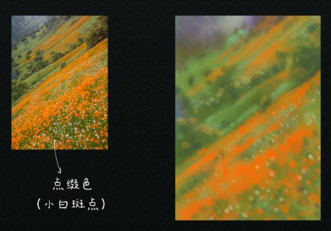 把参考图的状态调回正常状态,这时会看到前景部分有很多小白斑点,用颗粒感更加松弛的笔刷刷一些白色碎块。这里因为没找到合适的比较所以是用手点上去的。