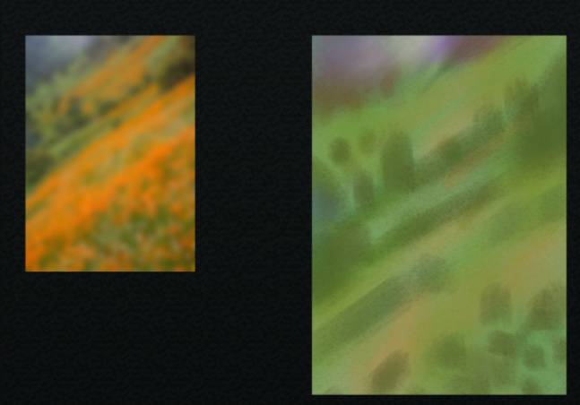 不规则边缘型:这类笔刷画出来的形状边缘会有更多的颗粒感,具有丰富的细节。一般在大关系定好之后,使用这类笔刷来制造细节和纹理。