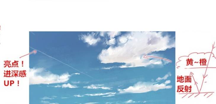 ④在近端云的下部分稍微打上一些橙色,给天空背景打一些笔触,表现出高层云与大气之间的相互混杂。飞机尾气可以作为一个亮点。