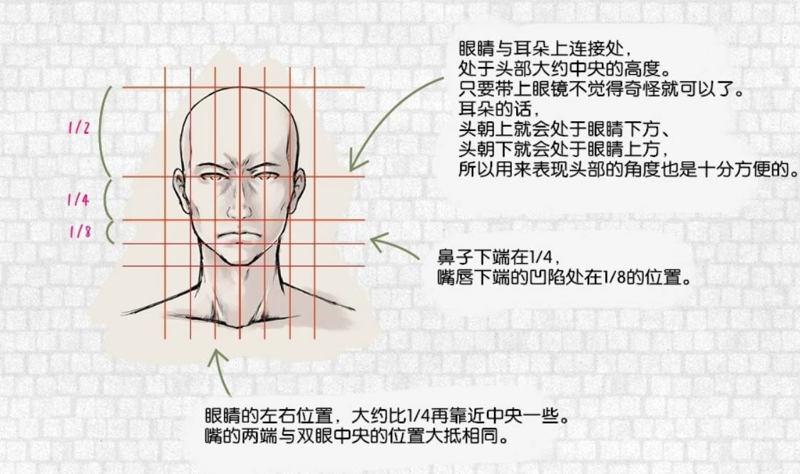 鼻子下端在1/4,嘴唇下端的凹陷处在1/8的位置。