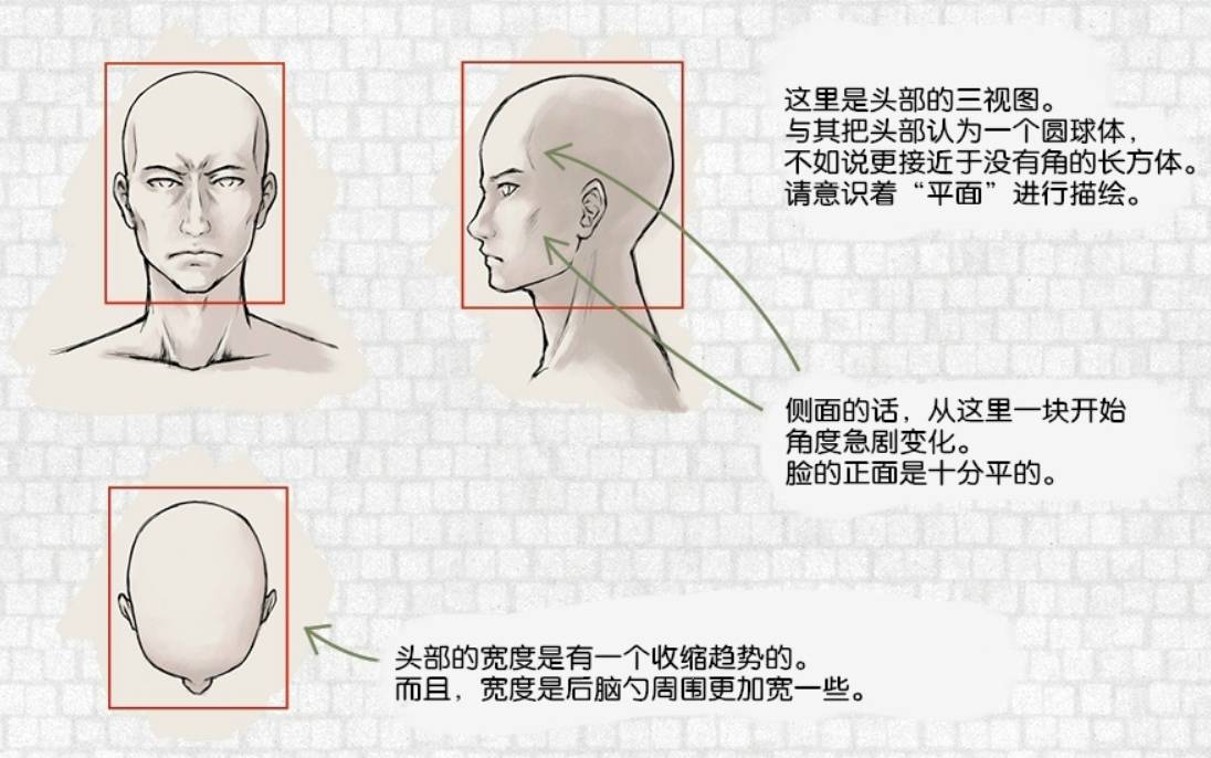 这里是头部的三视图。与其把头部认为一个圆球体不如说更接近于没有角的长方体。请意识着“平面”进行描绘。侧面的话,从这里一块开始角度急剧变化。脸的正面是十分平的。头部的宽度是有一个收缩趋势的。而且,宽度是后脑勺周围更加宽一些。