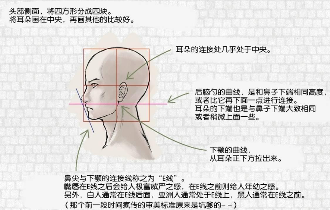 鼻尖与下颚的连接线称之为“E线”。嘴唇在E线之后会给人极富威严之感,在E线之前则给人年幼之感。另外,白人通常在E线后面,亚洲人通常处于E线上,黑人通常在E线之前。