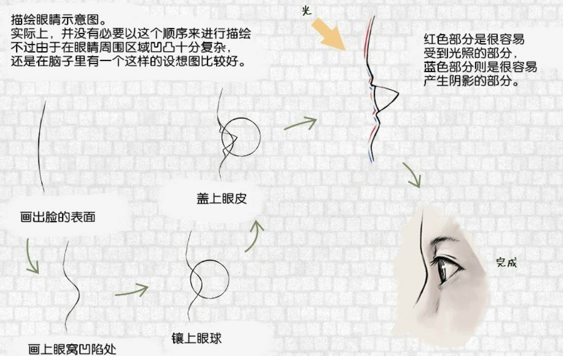 描绘眼睛示意图。实际上,并没有必要以这个顺序来进行描绘。不过由于在眼晴周围区域凹凸十分复杂,还是在脑子里有一个这样的设想图比较好。