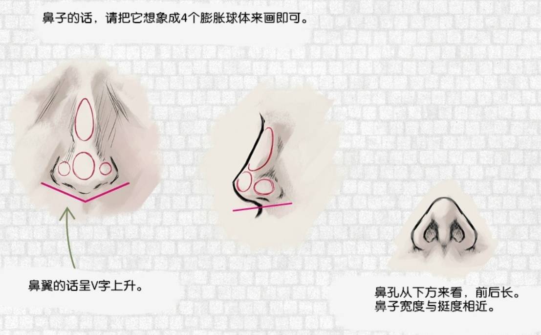 鼻子的话,请把它想象成4个膨胀球体来画即可。鼻翼的话呈V字上升。鼻孔从下方来看,前后长。鼻子宽度与挺度相近。
