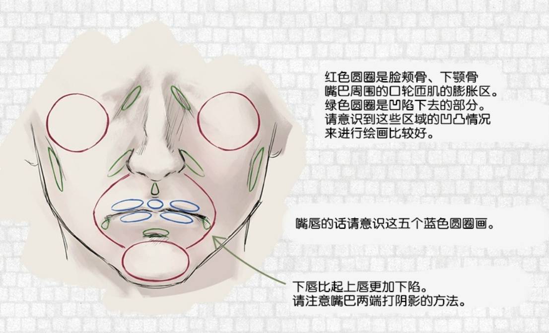 嘴唇的话请意识这五个蓝色圆圈画。