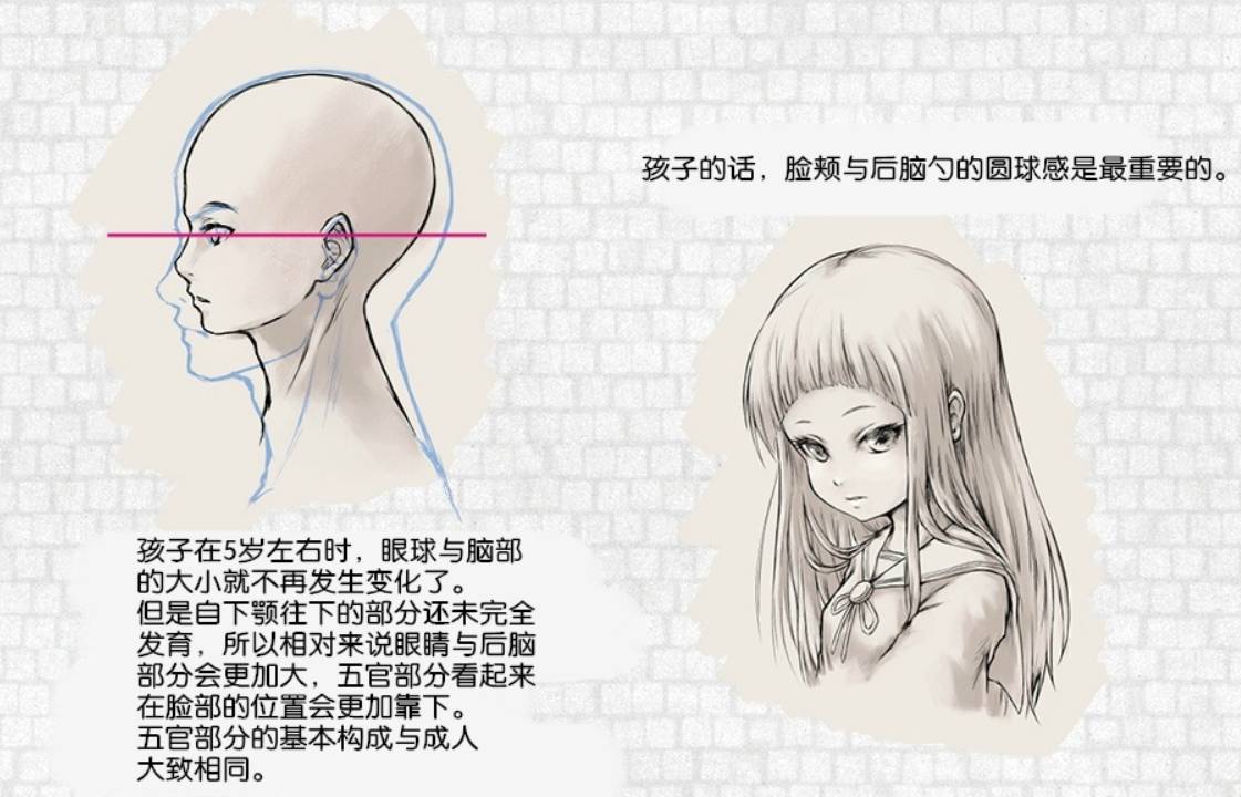 孩子在5岁左右时,眼球与脑部的大小就不再发生变化了。但是自下颚往下的部分还未完全发育,所以相对来说眼睛与后脑部分会更加大,五官部分看起来在脸部的位置会更加靠下。五官部分的基本构成与成人大致相同。