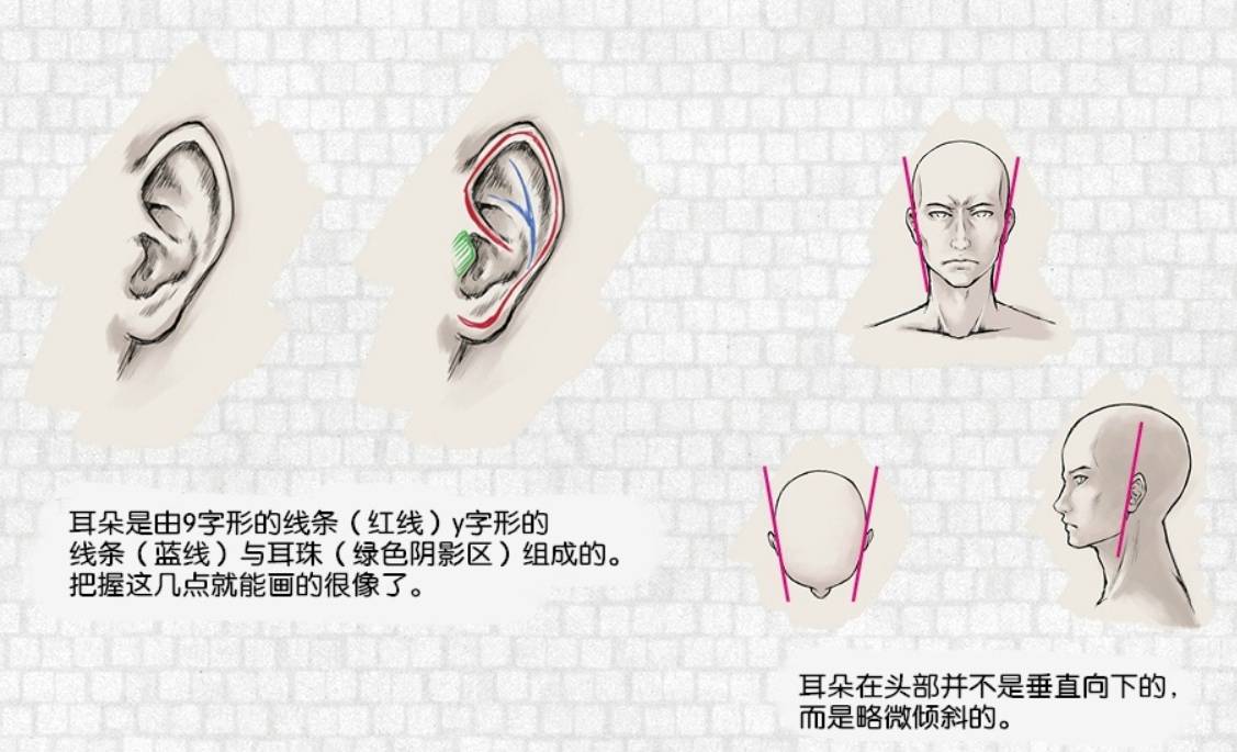耳朵是由9字形的线条(红线)y字形的,线条(蓝线)与耳珠(绿色阴影区)组成的。把握这几点就能画的很像了。