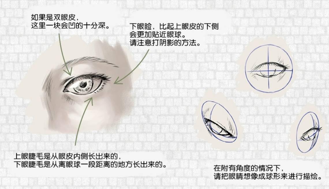 在附有角度的情况下,请把眼晴想像成球形来进行描绘。